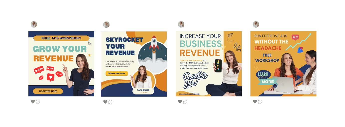 I designed a series of social media ads for Successful Ads Club, focusing on a campaign for the company itself. The project included four ad variations, each created to showcase different visual approaches and serve as teaching tools for clients. These ads were used to demonstrate how to structure effective campaigns and empower clients to build their own high-performing content.