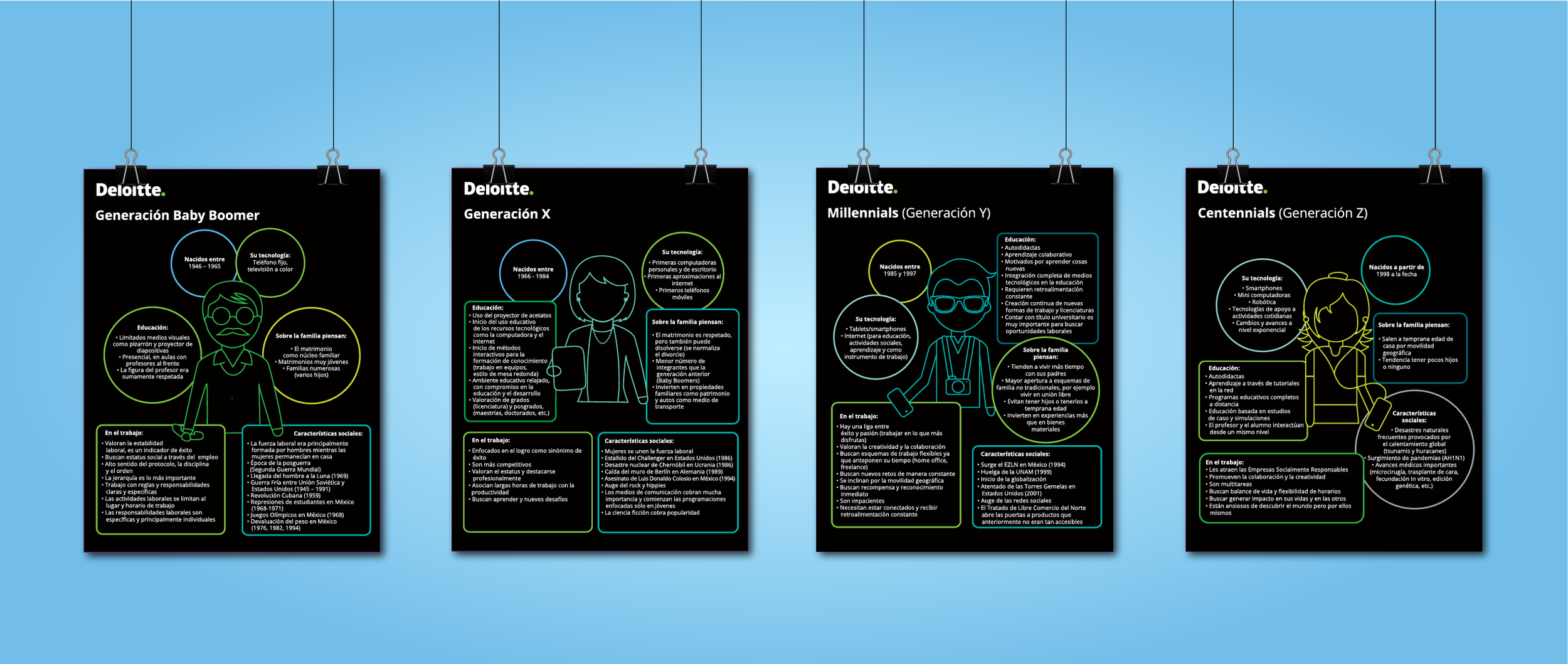 This project was requested by Deloitte's HR department in Mexico City for use at college job fairs to recruit talent from top schools. I collaborated closely with the creative director and copywriter to develop four infographics, each representing different generations. The designs adhered to Deloitte's color palette and brand guidelines, with high-contrast elements to ensure readability and impact.