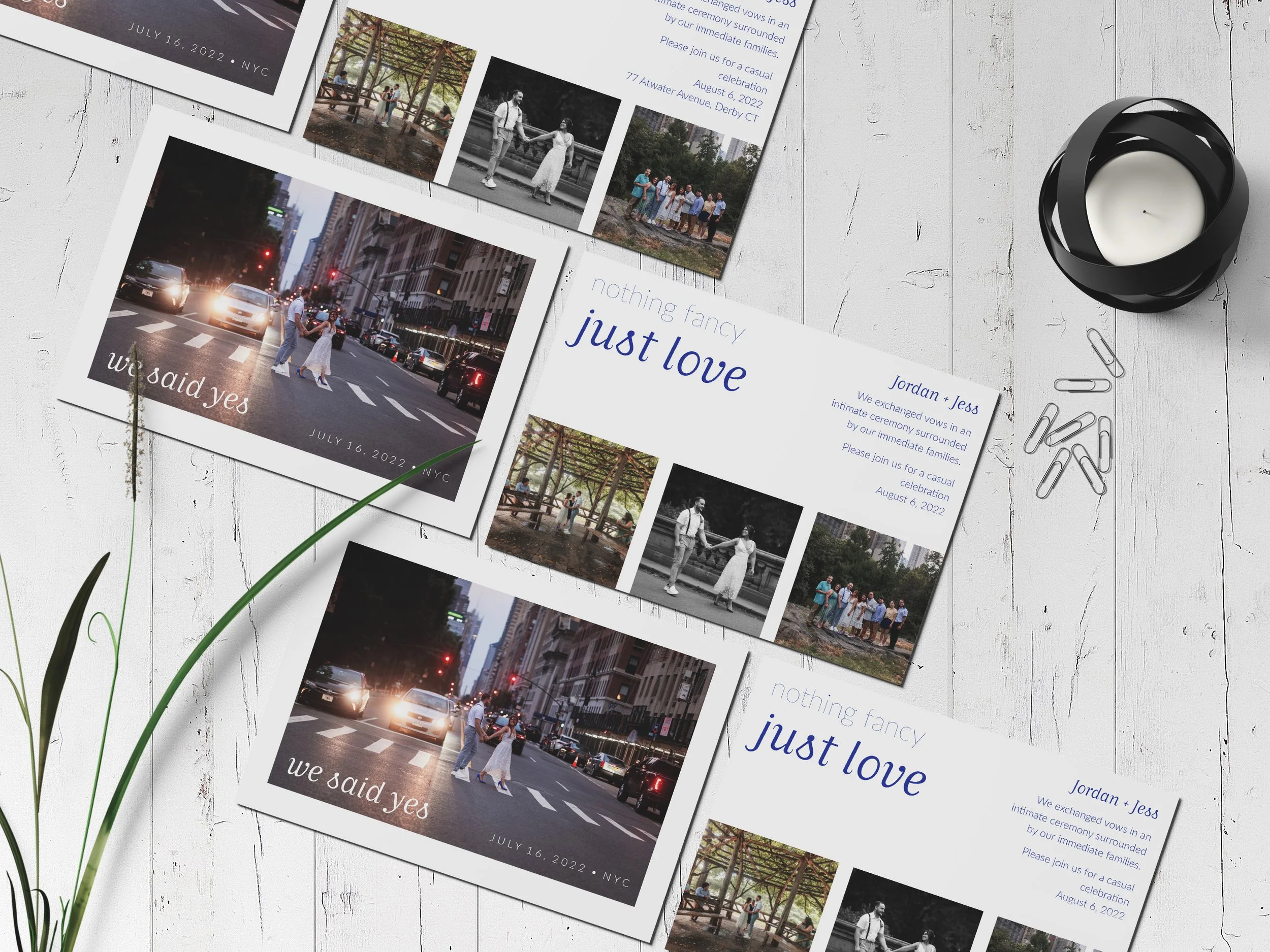 This was a personal project. In 2022, I eloped and got married in Central Park with just immediate family. To share the news with the rest of our loved ones, I designed a simple announcement postcard featuring the date, location, and our favorite photo from the day.
